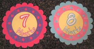 I don’t know what was going on about 9 months ago but I’m glad I wasn’t drinking that water! In the last month there are sooo many people having babies. I made these as a gift, they are stickers that you put on their shirt and take the monthly photo. This is just a couple of them, but there are 12 to get through the first year. The concept was not an original of mine, I saw it over at my cousin Beth’s blog. To create mine I used my Sizzix Eclips for all of the pieces and ran them through the Xyron to make them a sticker.