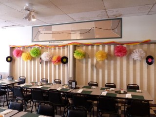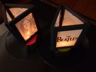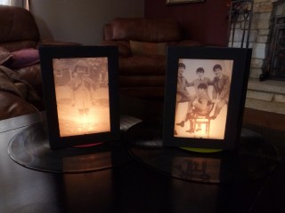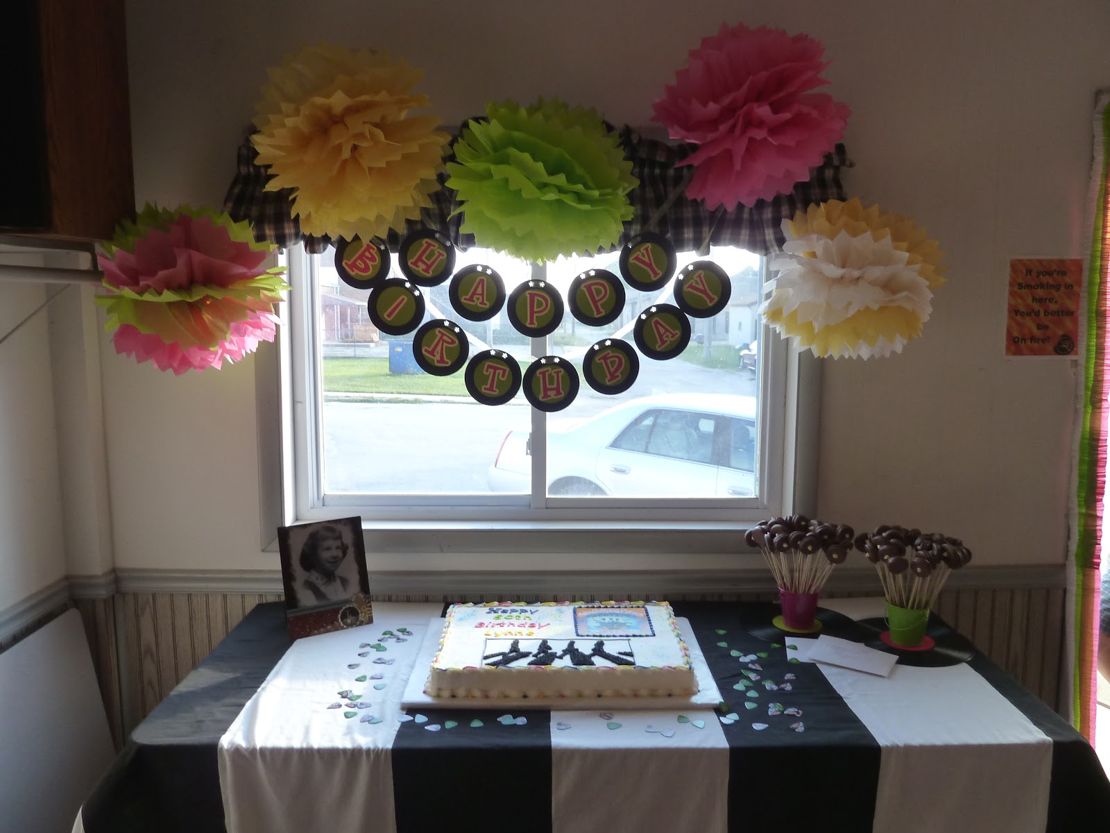 The centerpieces are frames I painted black and then used black electrical tape on the inside to attach the 3 together. I printed pictures of mom and Beatles related things on vellum paper. The glass is still in the frames, just not the back matting so the candle lights up the photo. Scott picked up a bunch of old records at Good Will so I just covered them with colored paper and we used those to set the centerpieces on as well as other decorations. The idea for the centerpieces came from Martha Stewart. The instructions for the tissue poms I also found on Martha Stewart. I know a lot of people don’t like Martha but I do and DVR her show daily!