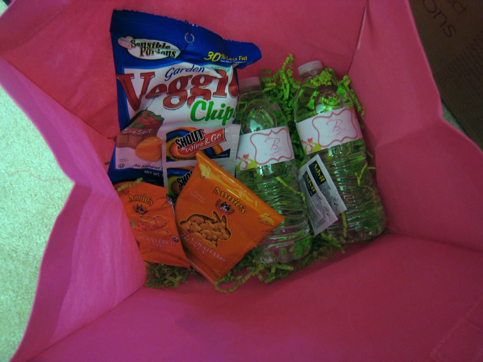 I got the pink reusable bags and the green filler I used in the favor boxes too. The favors will be in a post coming soon!