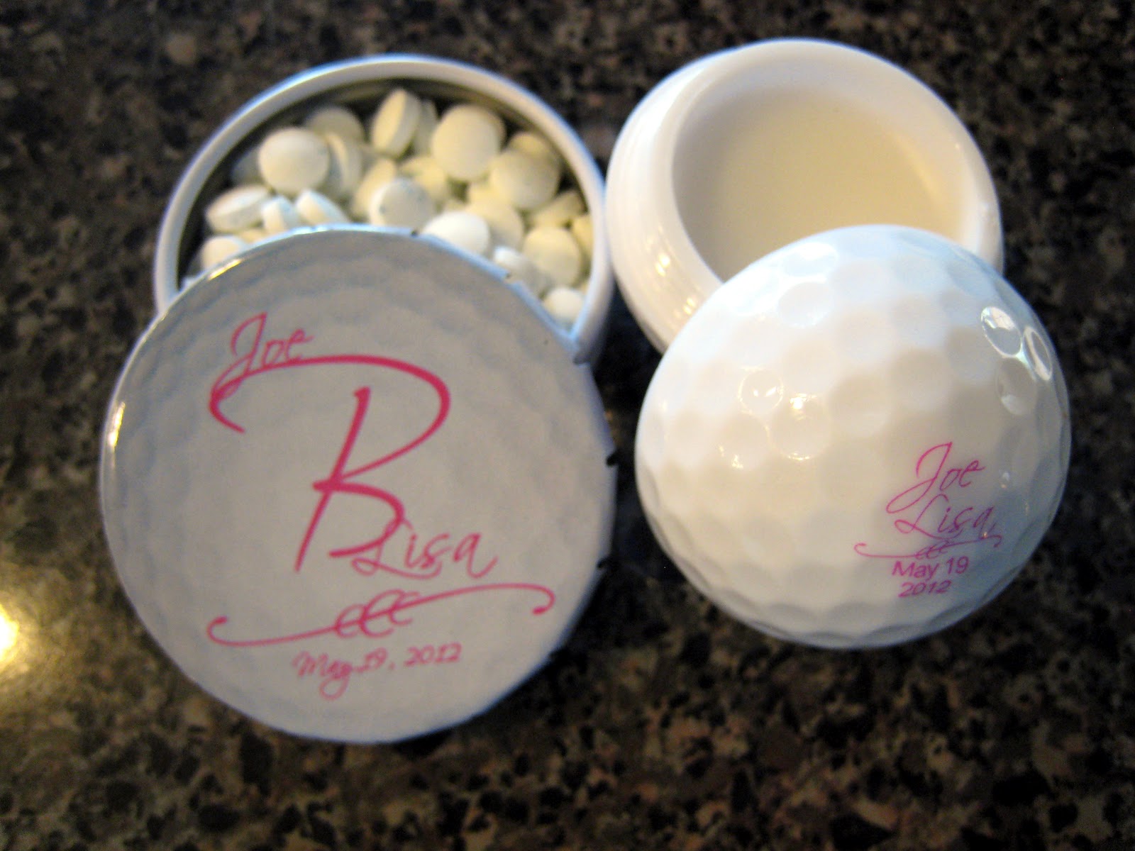 The wedding had a small golf theme, more tied in with the location and colors but I found golf related favors. I designed the logo and then worked with great people at Hanson Ellis for the golf ball lip balm and imprintgolf.com for the mints.