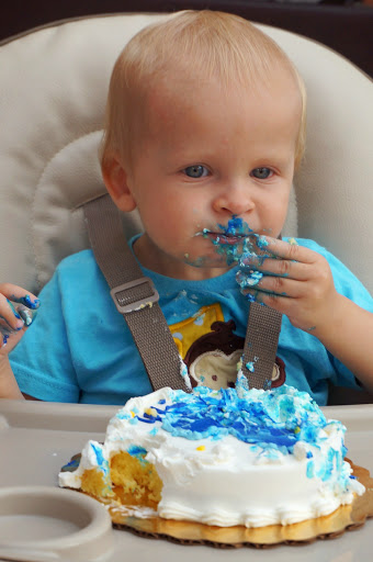 At first he didn’t really know what to do with the cake. We had to show him what to do and then he dug in a little. He’s not a messy eater so this is about as bad as it got.