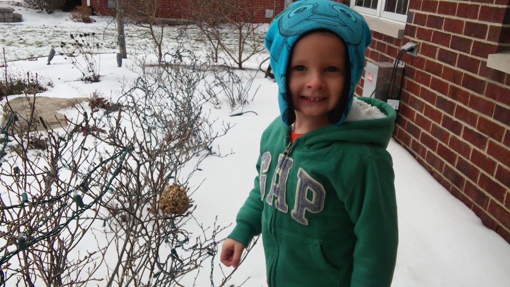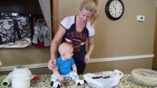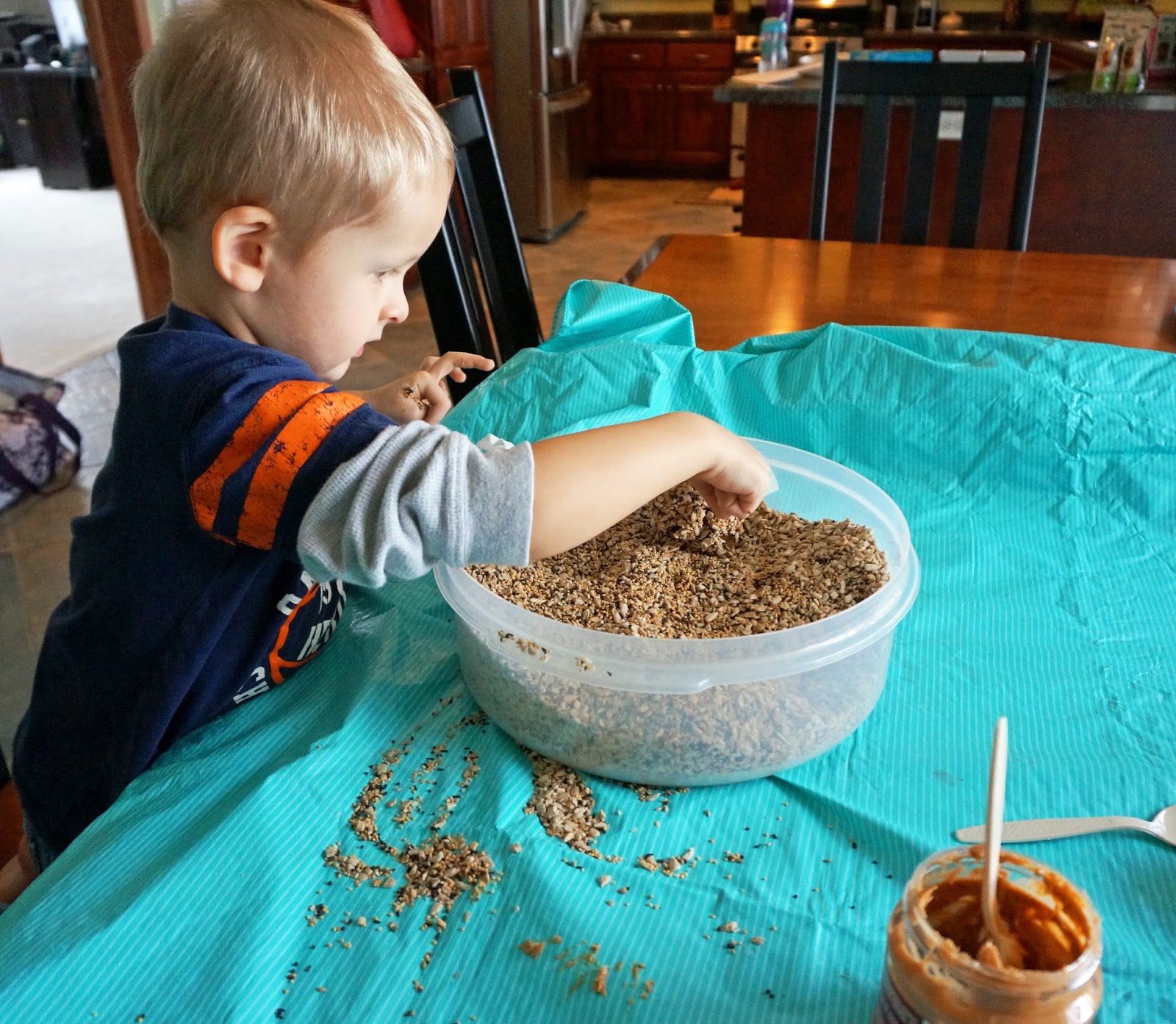 Once you have it covered in peanut butter roll it around in the seed. You can see that this is going to be messy. It’s hard for them to leave the seed alone and in the bowl!