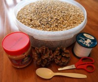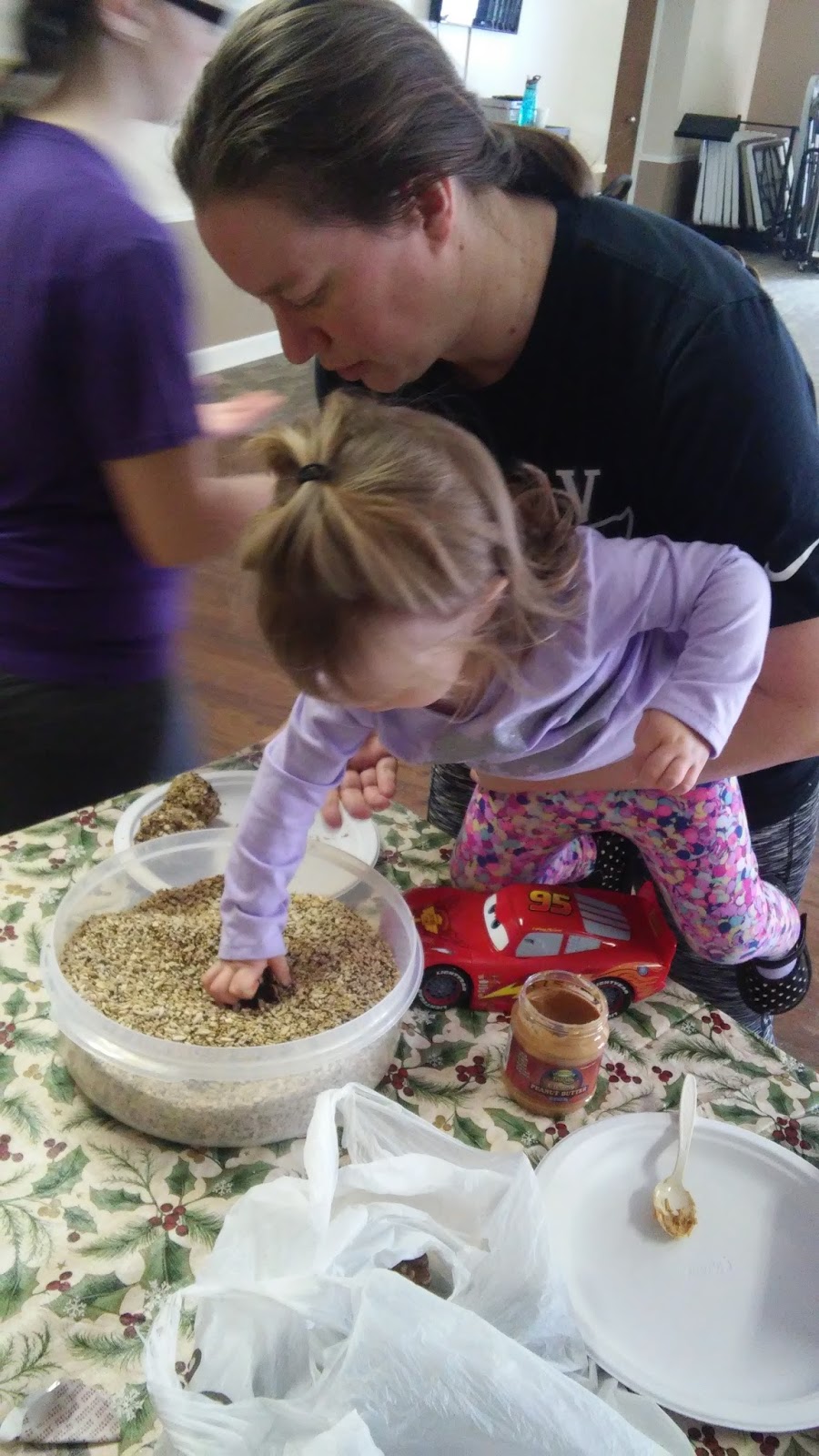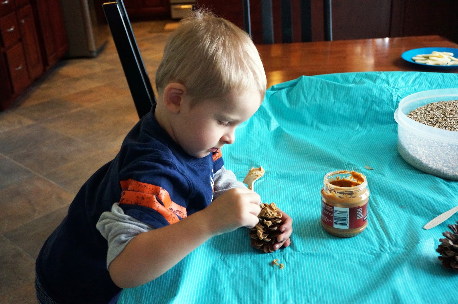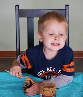 After you have the seed all done then you can attach the string. I just tied it to the top row/point of the cone. Some other moms thought it would be easier to put the string on before you start with the peanut butter. I am a little ocd when it comes to some things so I think if you had the string on you’d get peanut butter on it. It’s your call, but those are some options for you!!