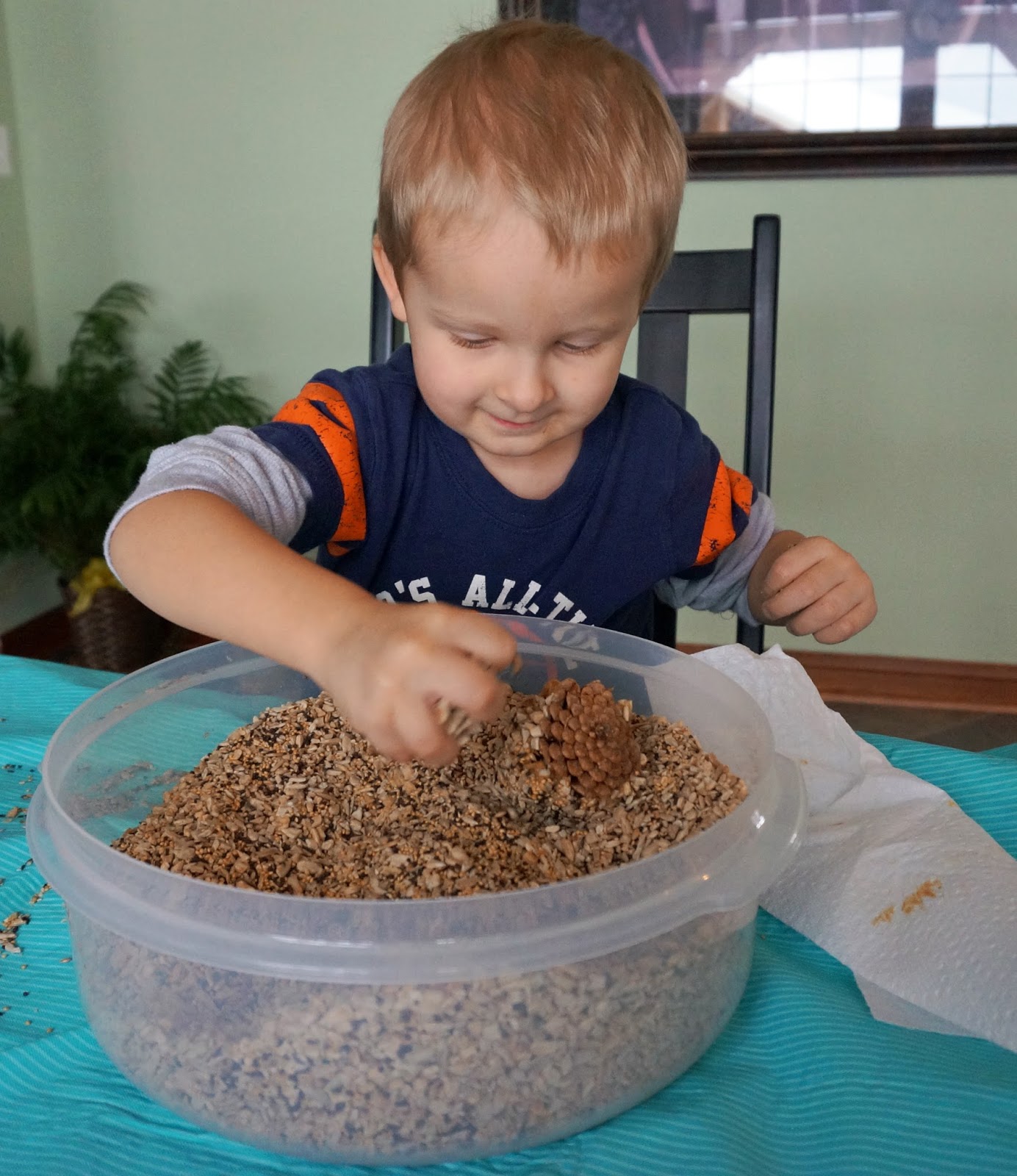 I had some pinecones leftover from another activity I did with a different group of moms/kids so I was looking for ways to use them up.