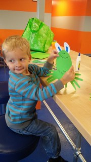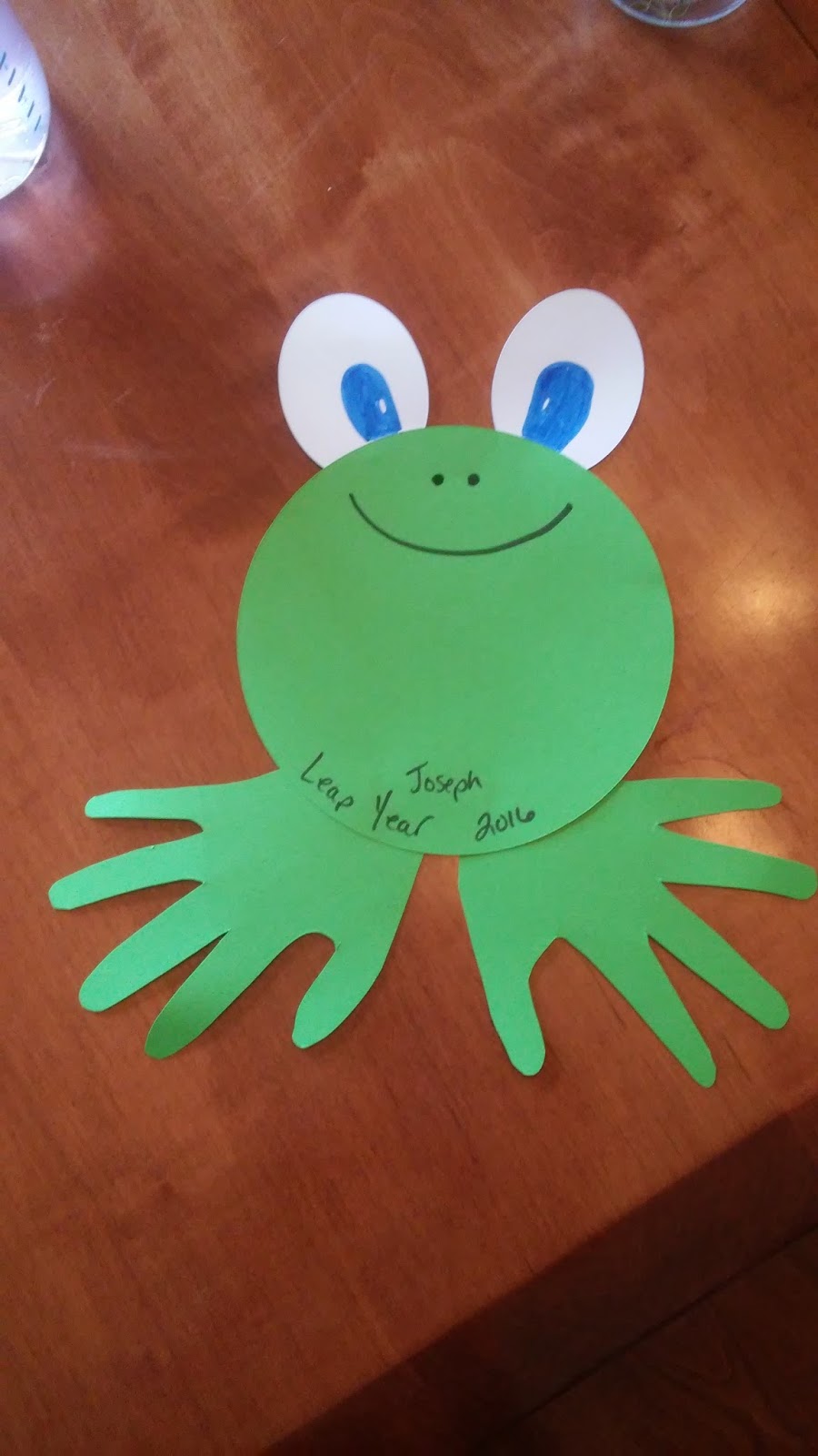 It’s a leap year! What other fun way to celebrate than with a leap frog craft. I probably do more handprint activities than what some moms would like because hands are typically challenging with little ones. JP has been pretty good with them because when he was young and we would color or use the magna-doodle toy I’m not much of an original artist so I’d trace his hand. I can copy but to just draw something off the top of my head is not really my forte. After a while he thought it was fun so even before he was 1 he would put his hand on the paper and take the crayon and try to trace his hand. It was 1 or 2 lines between his fingers but he understood what he was supposed to be doing.