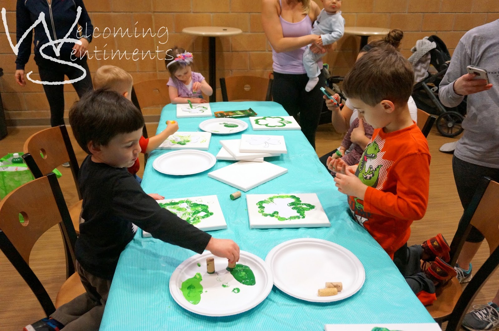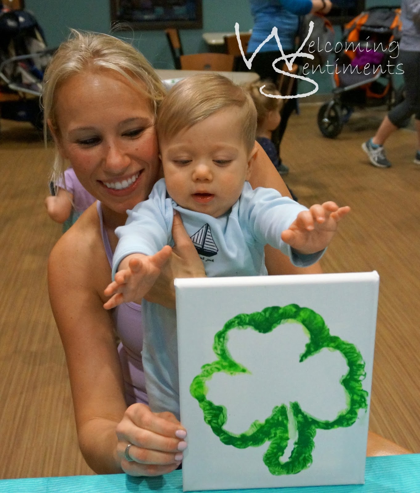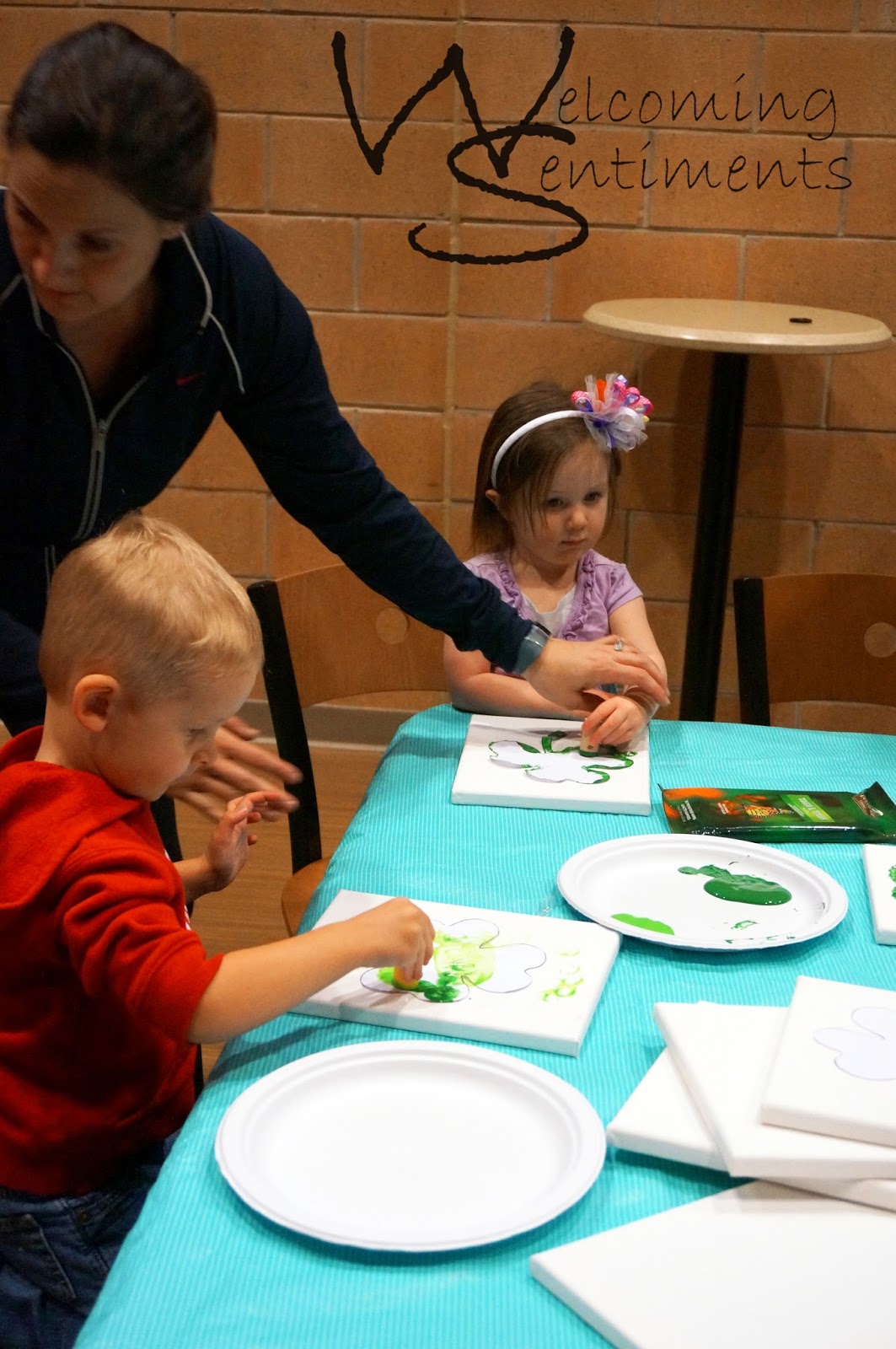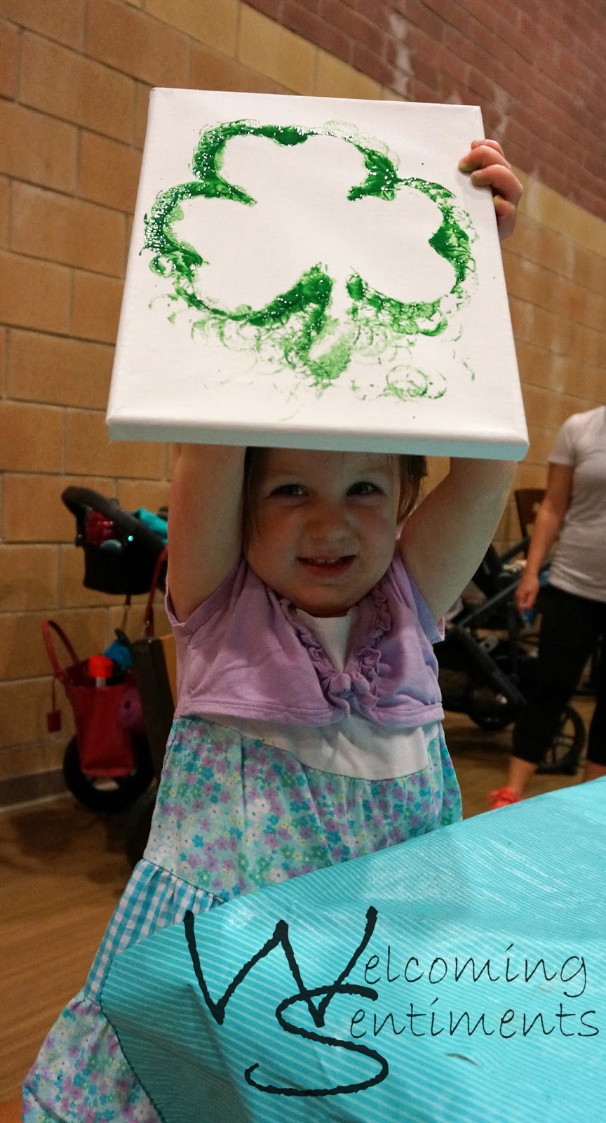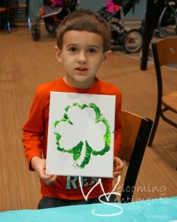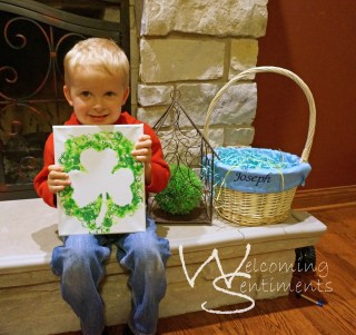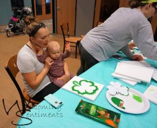 There are all kinds of fun things you can do with the kids for St. Patrick’s Day. I’ve done a lot of hand print crafts in the past and it’s a little challenging with the babies. I wanted something with paint because tracing and cutting hands take a little time. Time and free hands just aren’t something that go along with little ones running around or needing held!