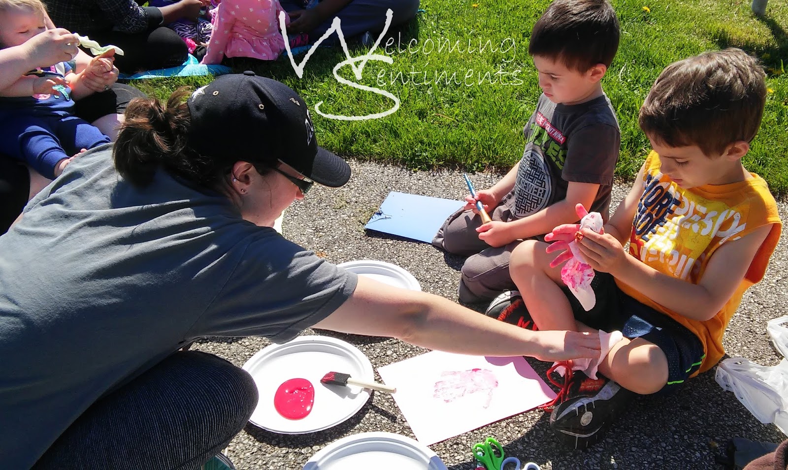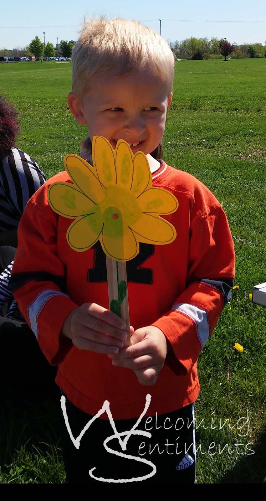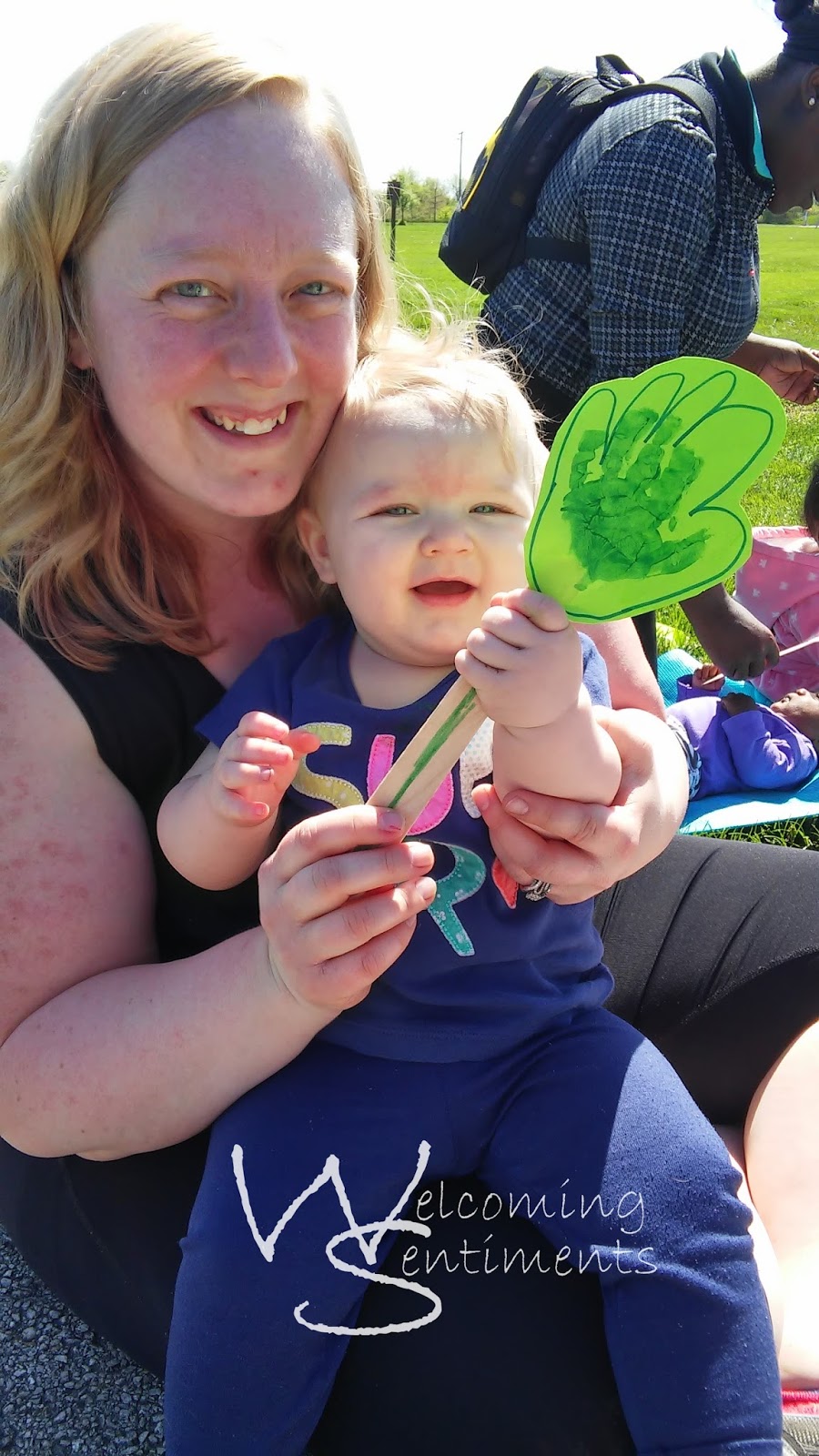 Our craft this week was a hand print/flower. We started by doing a hand print, then after the paint dried used marker to make the ‘flower’ around the hand print. Next we cut it out and glued it on a popsicle stick.