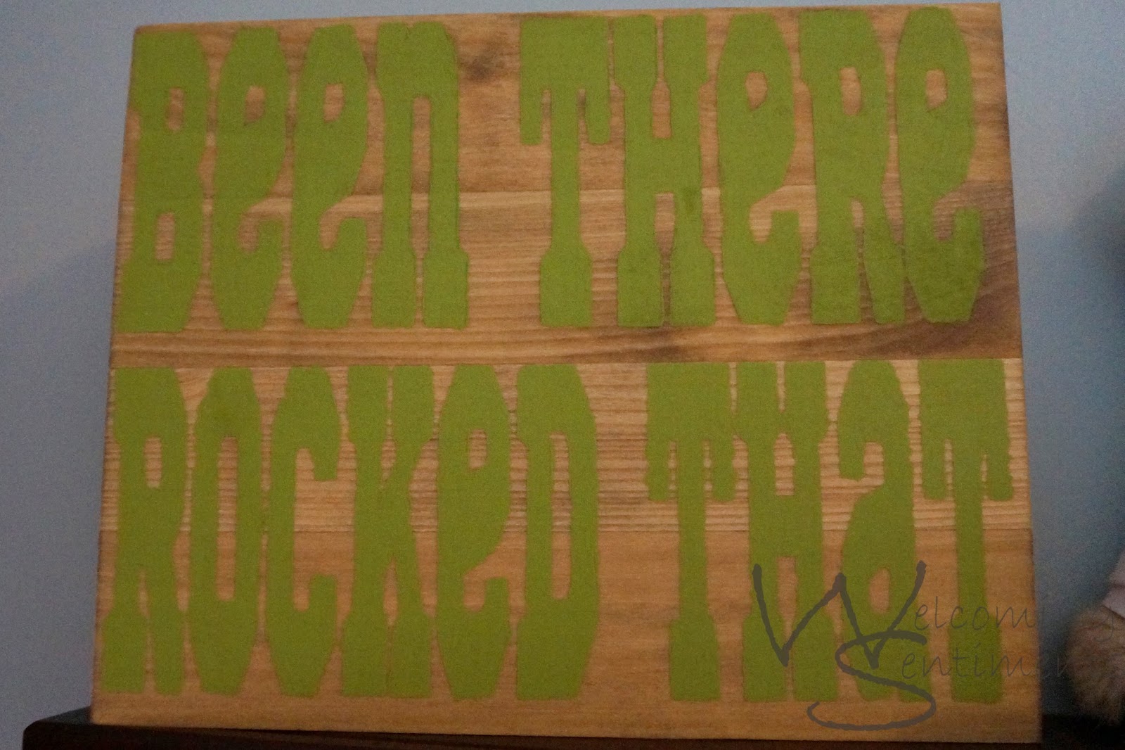 I also made the Been There Rocked That wood sign.  I found the wood box at Michaels, lightly stained it and did another stencil on my Eclips and painted it in the lime green.  The words don’t show up quite as much as I’d like but it’s fine.  Someone had given us the J when he was born so I repainted it in the same lime green.