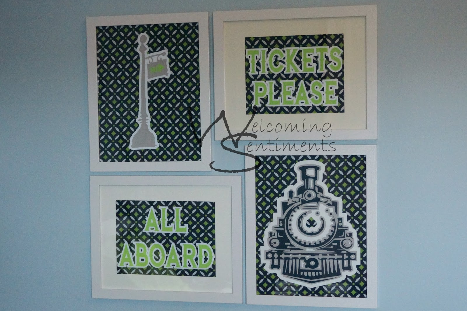 I found these frames at Michaels on sale and used the material I had from the party table backdrop for the matting.  JP’s favorite movie is Polar Express so Tickets Please and All Aboard  were no brainers as saying to put somewhere in the room.  The post sign was on the same Eclips cartridge and I found the front view of the train online and then cut it out with the Eclips.
