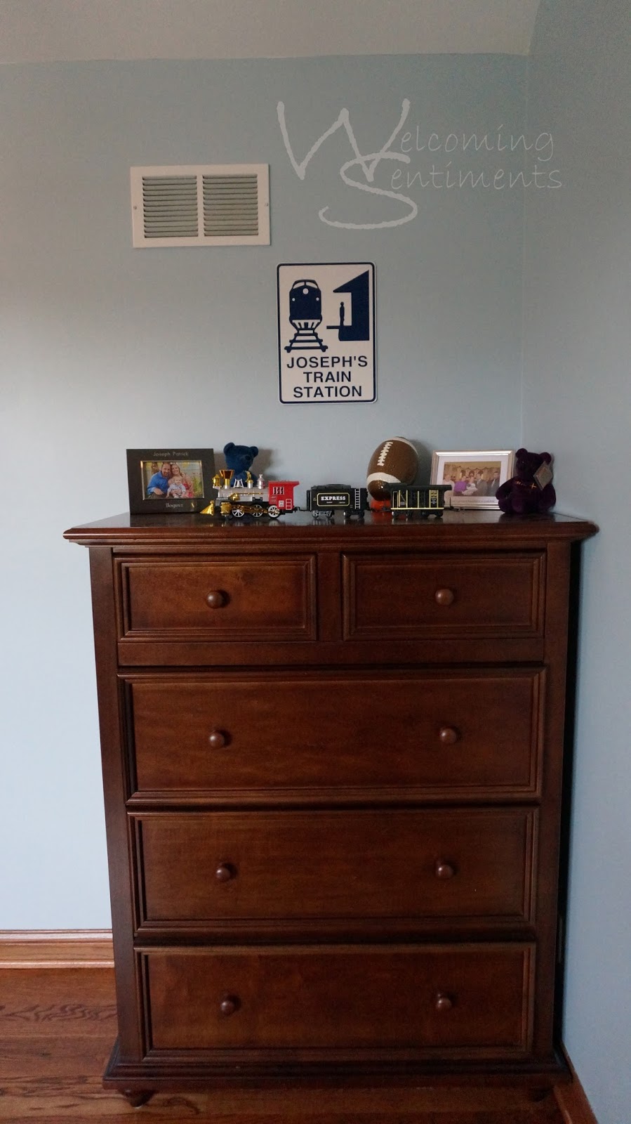 I’ve been waiting for so long to finally do this post.  The room took a little longer than anticipated to get all of the finishing touches done and then remembering to actually take pictures.  This was also a long time in thought.  I don’t make decisions quickly so once I get it into my head that I’m re-doing a room I think and think and scour Pinterst and think some more then I almost have to stop thinking for a while for the ideas to come.  I am super excited at the final result because my vision actually came true but I also made so many of the touches myself.  Other than Thomas there aren’t a ton of little boy train room ideas or things out there to buy.