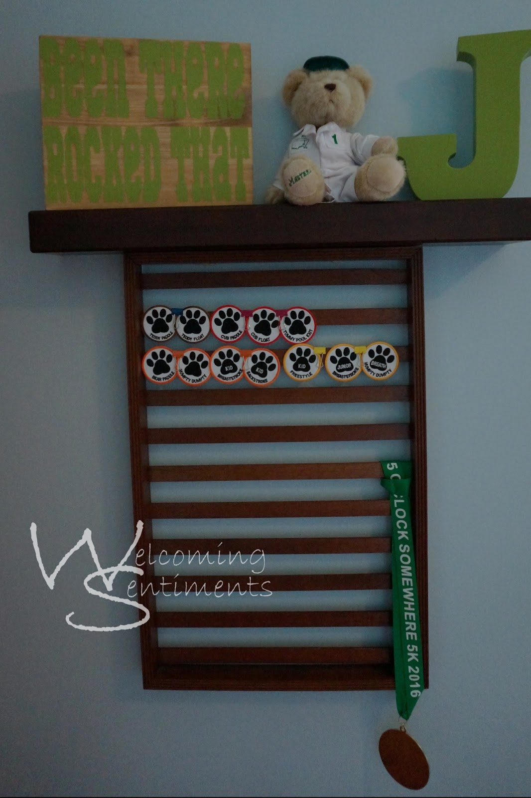 With the patches from swimming I needed a way to have his little awards section.  The shelf is a shelf we had in the original nursery.  The rack below it is actually a match book display rack.  My grandpa used to collect match books.  Are you old enough to remember when restaurants, hotels etc. had them for you to take?  Well, he collected them and my mom found this rack to display them with.  He went on to replicate this and made a handful of additional ones.  Around the time I was pondering all of my ideas for the room my mom asked if my brother or I had any use for them.  I thought it would be perfect for ribbons, medals and those type of awards.   The color of it was perfect so I didn’t have to refinish it and just hung it directly under the shelf.  He even already has a 5K medal.  He ran a virtual one with me…well he was in the stroller!