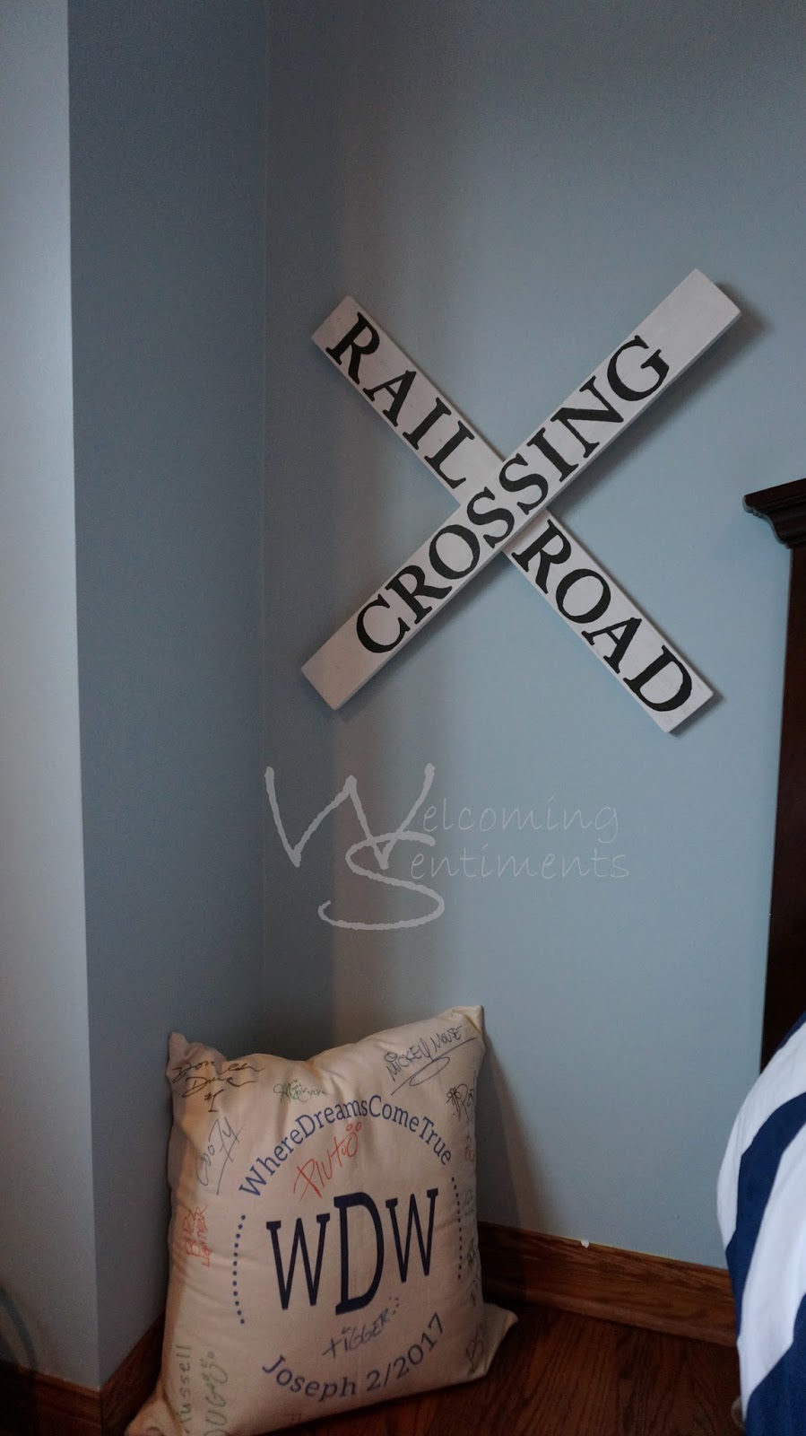 I guess it all started about a year ago when preparing for JP’s 3rd birthday which was a train theme.  I made the rail road crossing signs to have at the party.  As I did that party in blue and lime green I decided that those would be the colors in the bedroom too.  The material in the picture collage was used at the party too.  I also found the JP’s train station on Amazon and used it for the party.   I found the rug on Overstock.com.  I didn’t know this at the time but I recently noticed it has the same pattern as in the material in the picture collage.  Crazy!  I seriously didn’t coordinate that. I guess you are drawn to the choices you make for a reason.