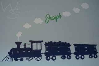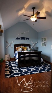 This was my first attempt at creating vinyl wall decals myself but these are so expensive on Etsy and I wasn’t finding anything that I really liked.  They were all very ‘little kid’ style and I didn’t want that.  I wanted him to be able to grow into the room.  I actually had this train on one of my old Eclips cartridges so it was easy to cut out.  Each train car is about 12×18 so it’s pretty big.  I created a paper template first to make sure sizing was ok and going to look how I wanted before cutting the vinyl.