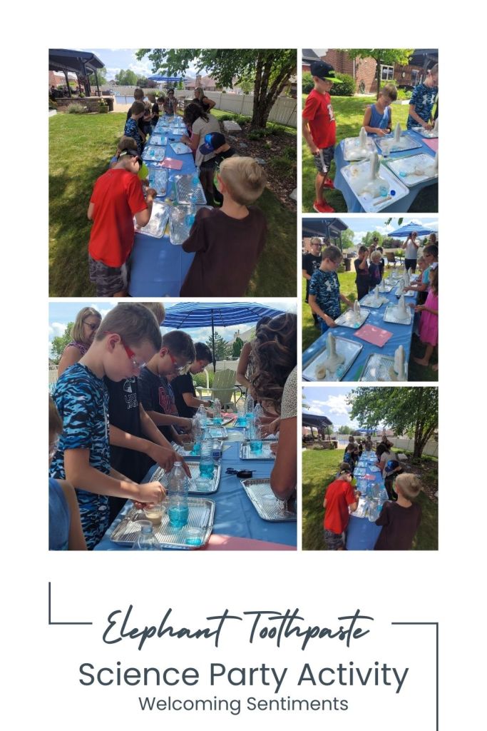 The next project we did can be messy. We made Elephant Toothpaste. To prep for this I purchased 2 sizes of plastic condiment/jello shot type of containers. I collected empty water bottles and pre-filled them with the peroxide. The other supplies went into the little containers. Everything was pre-sorted for each kid in a bag on the trays. This doesn’t explode but I still had the kids jump back when they mixed everything. It oozes out and they thought it was so cool.