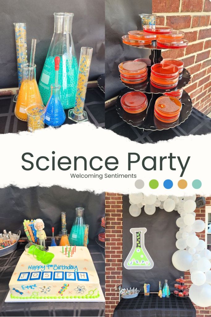 For the other decor items I created the large background using my Cricut. It’s much larger than it can cut so in Design Space I sliced it into pieces small enough to cut. Once the pieces were cut I assembled it back together on the backdrop. The beakers were filled with water beads.